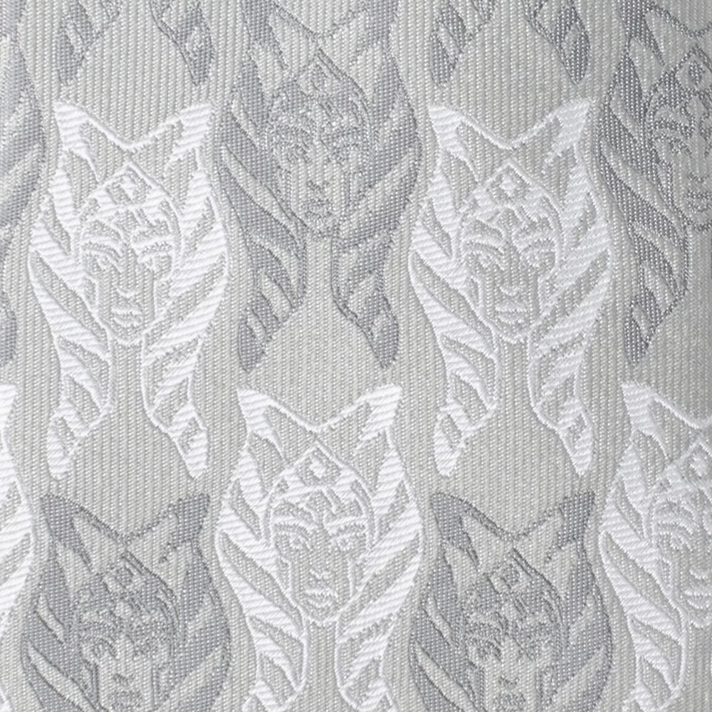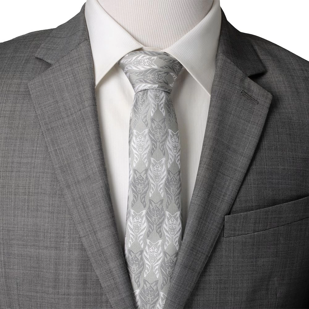 Ahsoka Tano, former Padawan to Anakin Skywalker and master of the Force, creates the pattern of this blended silk tie. Her head, complete with its distinctive striped lekku, is woven in alternating dark gray and white threads, which are emphasized by the silver base. For the sartorially stylish Star Wars fan, it’s definitely on the elegant side.