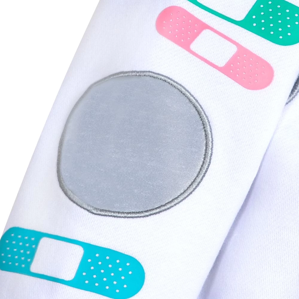 - Colorful screen art band aids on front, back, and sleeves