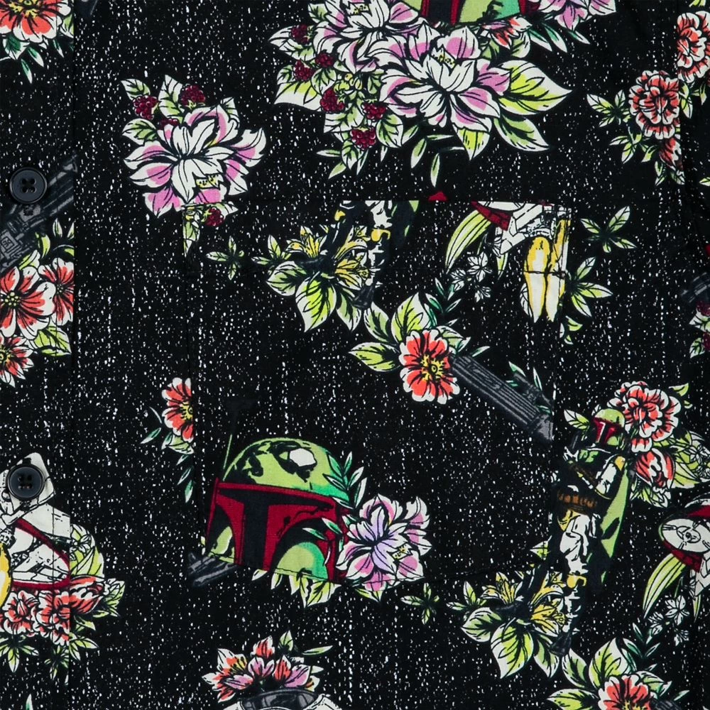 - Allover tropical print pattern features Boba Fett and related icons