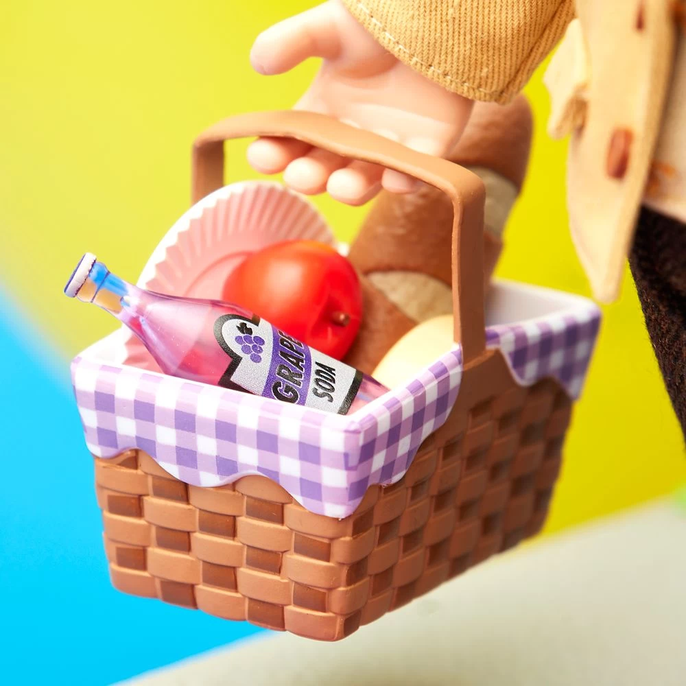 - Accessories include picnic basket with blanket, bottle of soda, loaf of bread, cheese, plate, two tomatoes and gingham placemat