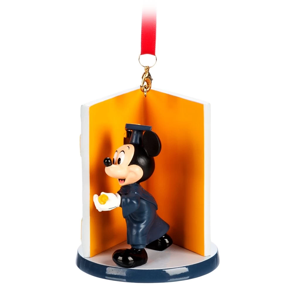Put some pomp in your circumstance with this celebratory, fully sculpted ornament featuring Graduate Mickey in complete cap and gown costume. A glittering ”Grad card” backdrop with fabric tassel enhance the scene. Makes a great gift for anyone moving on to the next level.