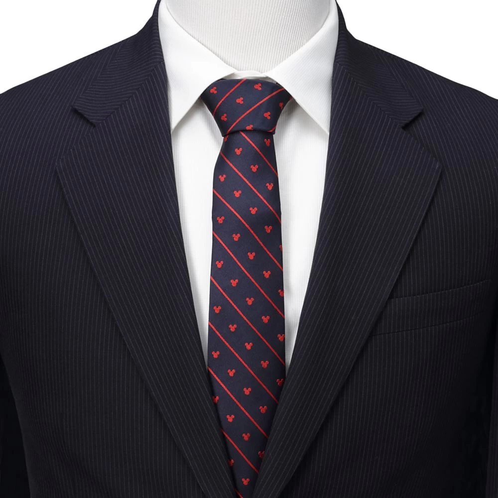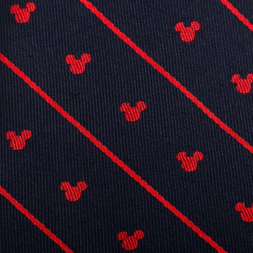 Make a Mickey fashion statement in this classic silk tie featuring a pattern of Mickey icons and diagonal pinstripes. The contrasting red and navy blue colors make it a versatile option for different suits.