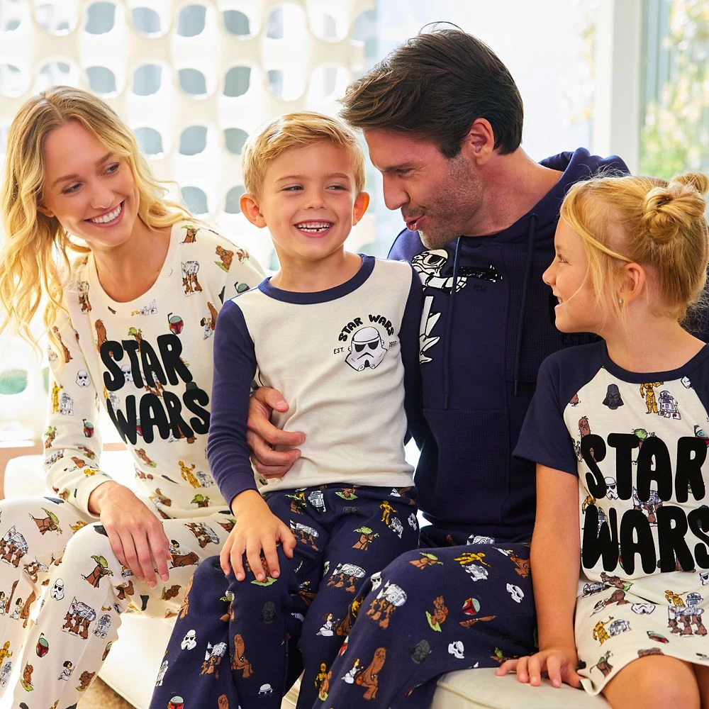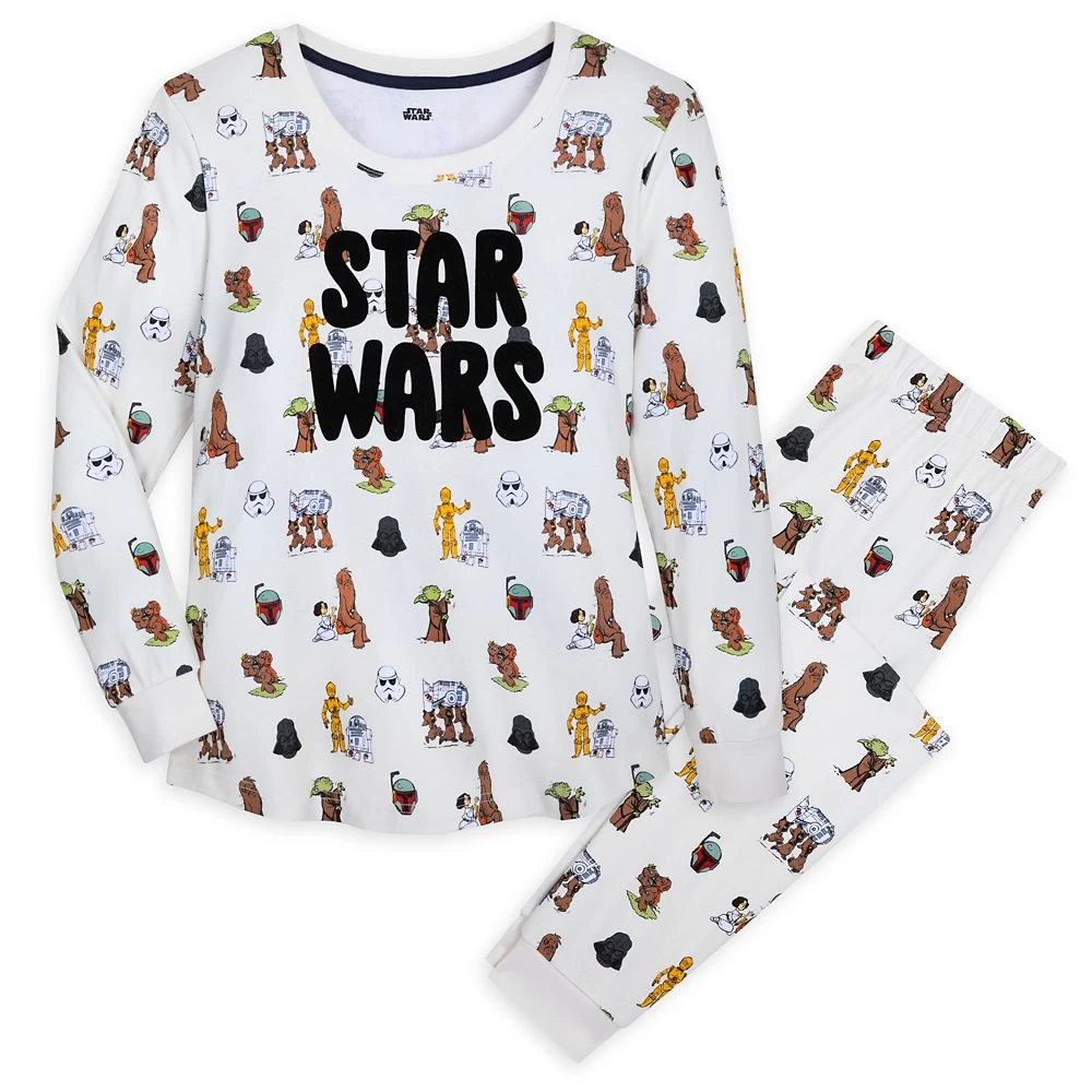 As soft and cuddly as a Wookiee getting his fur brushed by a princess, this comfy Star Wars saga sleep set features a vintage-inspired allover print starring some of your favorite characters doing their thing. With a stylized Star Wars logo on the top, the two-piece cotton set includes a long sleeve top and coordinating jogger pants so you can be your comfiest while you do you.