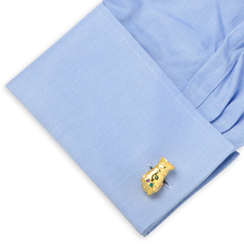 These striking cufflinks depict the Infinity Gauntlet of Thanos from Avengers: Infinity War. Finely detailed dimensional design with a goldtone finish, the jeweled accents represent the Infinity Stones: Space, Power, Reality, Time, Mind, and Soul.