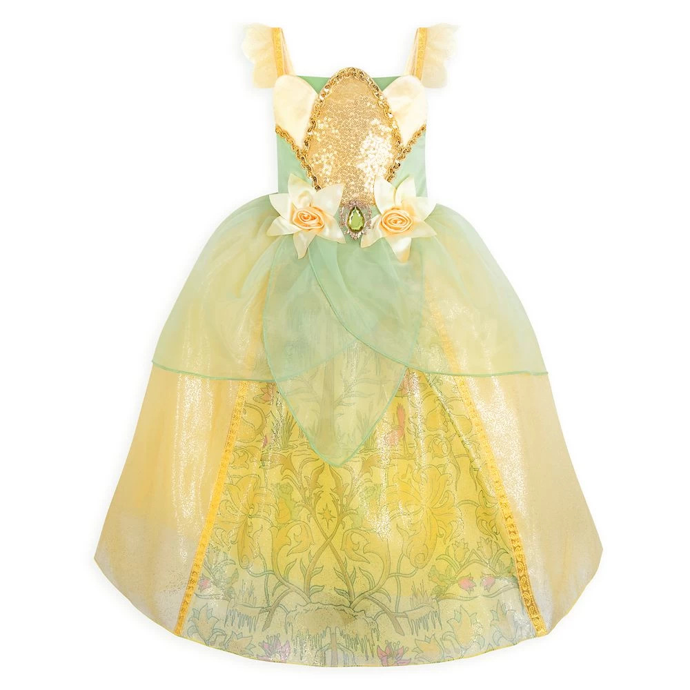 Your little princess is sure be crowned best dressed at the masquerade ball in this tiered Tiana costume. Beautifully detailed with green organza petal peplum, floral appliqués with a jeweled brooch at the waist, sparkling sequins, golden trims and fairytale filigree it really is like a wish come true.