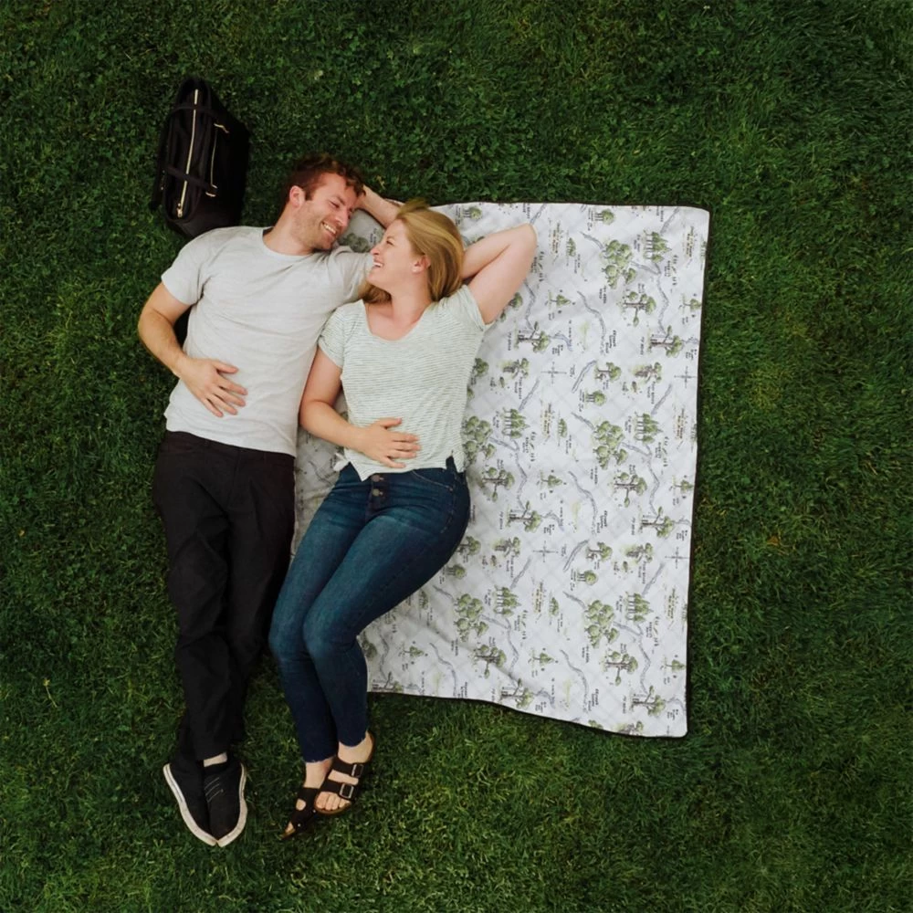 Picnics are always more fun in the company of Winnie the Pooh whose Hundred Acre Wood is featured in the allover design of this ultra-light picnic blanket made of water-resistant polar fleece! Not only can you get cozy with a soft, snuggly, and perfectly portable picnic blanket set, you get a handy drawstring backpack too. Easy to spread out for the whole family, the blanket folds easily to stash in the bag which features a delightful illustration of Pooh who’s pictured outside ”Pooh Bear’s Howse.”Â